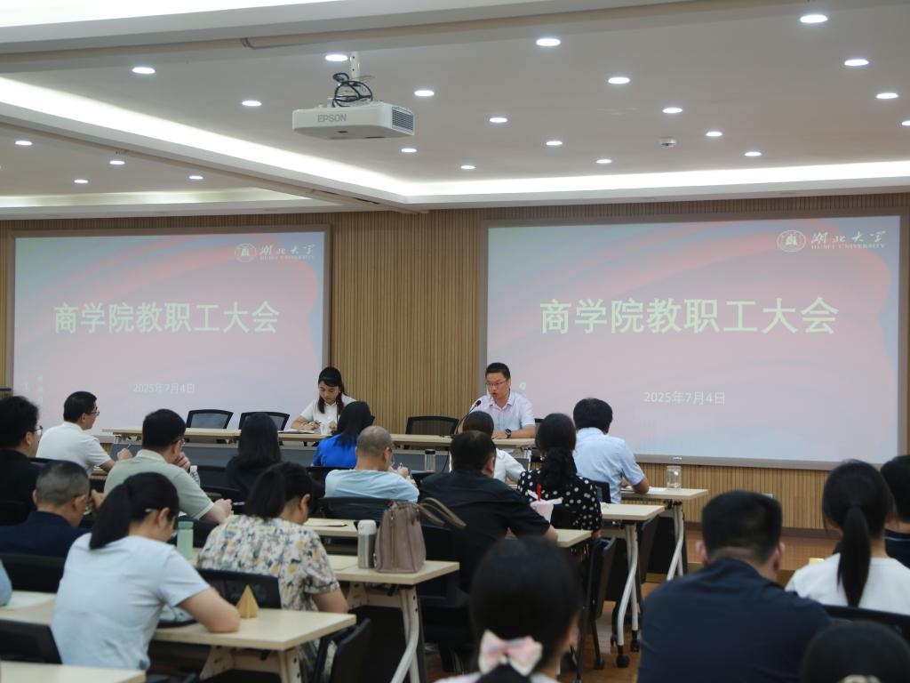 7月4日下午,商学院在逸夫楼C2014报告厅召开全体教职工大会。会议由党委书记何肖主持。