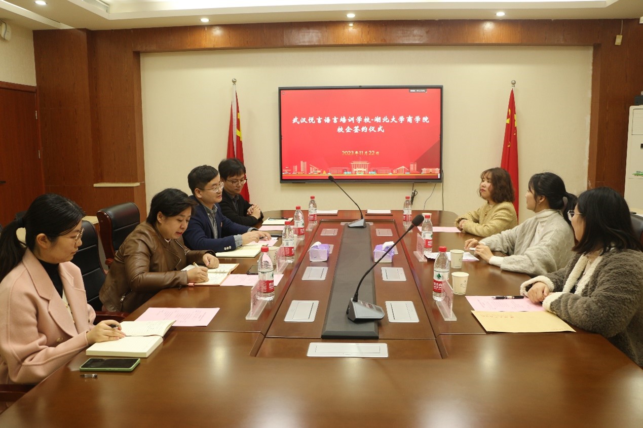 11月22日,开云app登录入口与武汉悦言语言培训学校校企合作签约仪式在逸夫楼C2008会议室举行,商学院党委副书记邵阡,学工办辅导员甄国辉、吴美娅、胡俊杰,武汉悦言语言培训学校校长徐苏敏、销售部经理宋改革、教师张晓玥参加签约仪式。