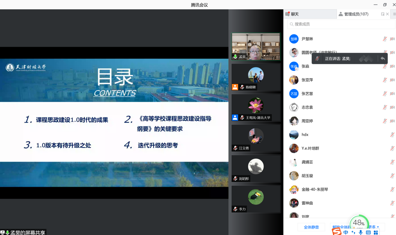 会上,孟昊教授从课程思政建设1.0时代的成果、《高等学校课程思政建设指导纲要》的关键要求、1.0版本有待升级之处、迭代升级的思考四个方面报告了课程思政建设。孟教师指出课程思政建设1.0时代的成果形成了思想共识,建设工作从无到有,从弱到强,思政教育从课程、内容、团队等方面形成了代表性模板。因学科间发展不平衡;工作体系和教育体系不健全;教师队伍、课程建设、课堂教育尚不完善;内容挖掘不全面;公共基础课和实践课不足等,课程思政1.0版本有待升级。