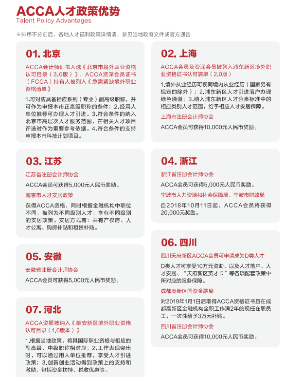 武汉市人民政府公告称,对取得特许金融分析师(CFA)、金融风险管理师(FRM)、北美精算师(ASA)、中国精算师(FCAA)、英国特许注册会计师(ACCA) 执业资格证书后在我市金融系统全职工作满2 年的,按照每人2 万元的标准给予一次性奖励。
